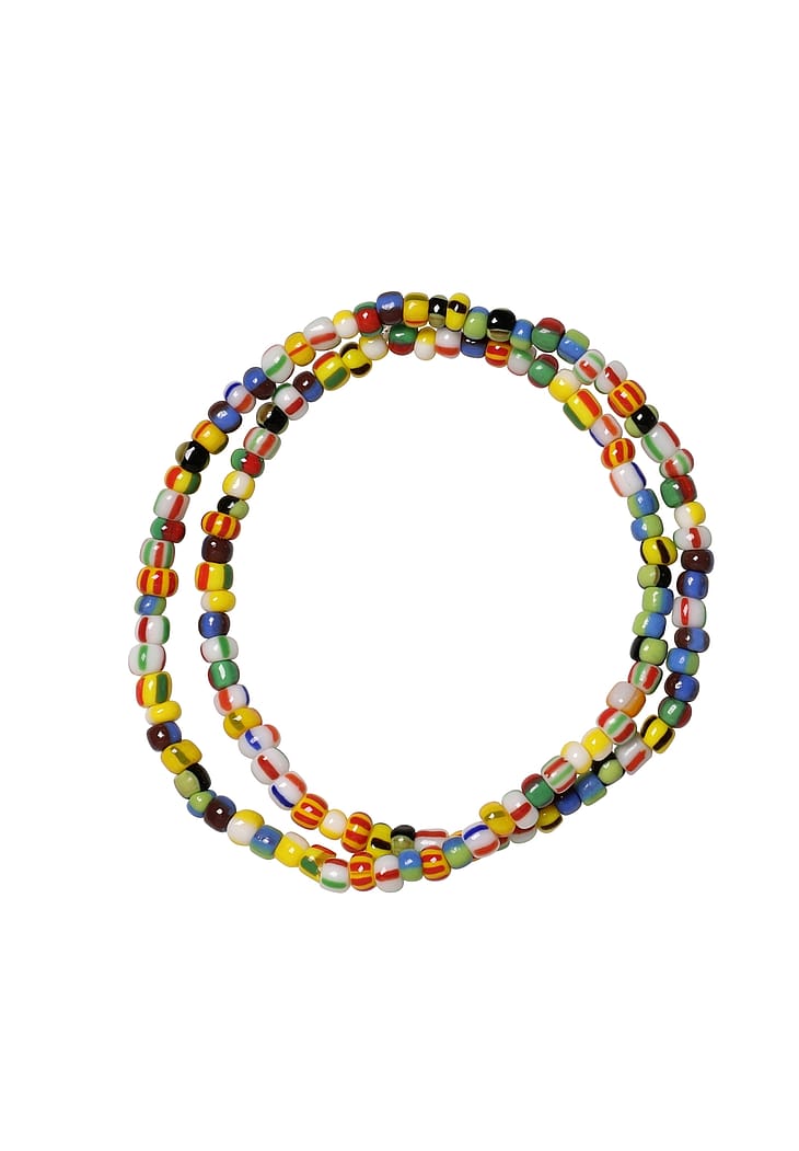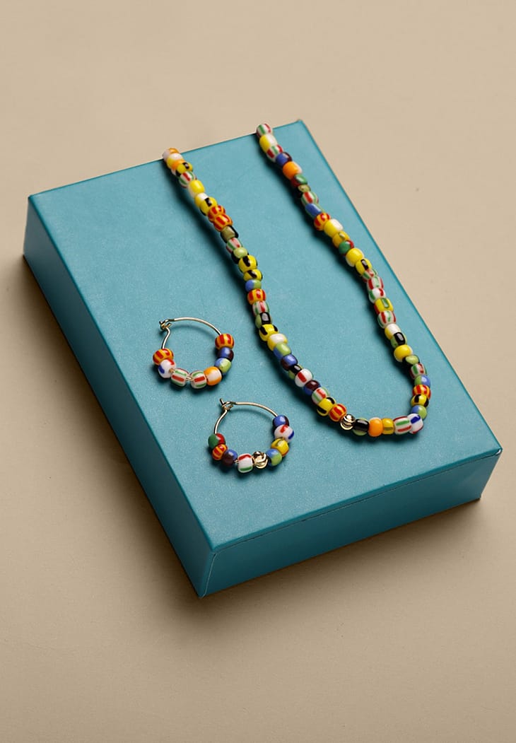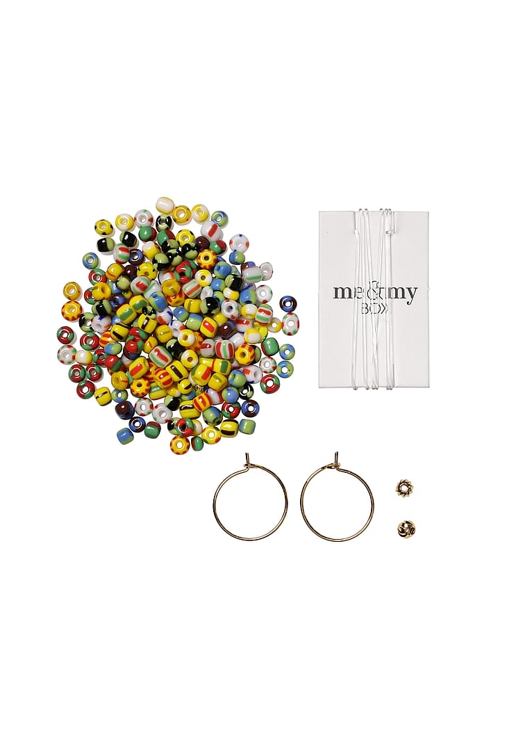 Projektet indeholder 1 halskæde eller 2 armbånd med fineste mix af stribede glasperler, samt et par guldbelagte hoops, og 2 forgyldte håndlavede kugler med indgraveret mønster.