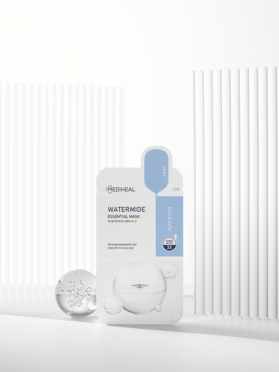 Mediheal Watermide Essential Mask er en kølende og fugtgivende maske med Sea Salt Aqua Seal, niacinamid og glyceryl glucoside.