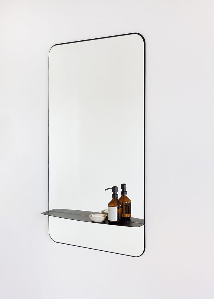 Den sorte pulverlakerede metalramme giver et eksklusivt og tidløst udtryk. De afrundede hjørner og den forskudte spejloverflade bryder det klassiske look og tilføjer en moderne dimension, der gør spejlet til mere end blot en refleksion – det bliver et designobjekt.