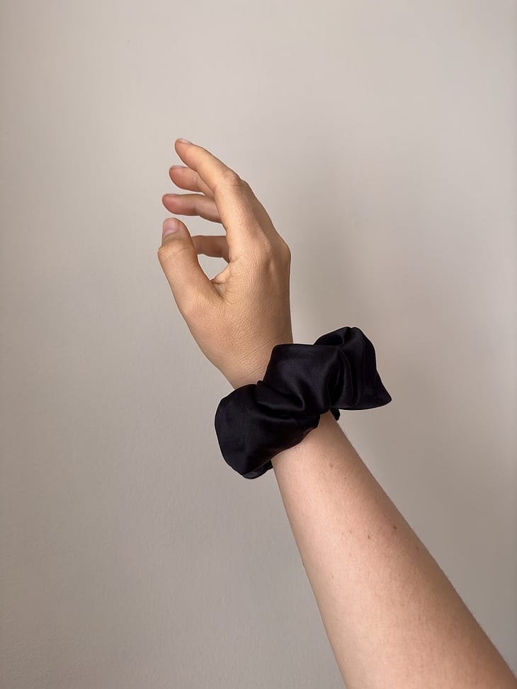Mellow Minds silke scrunchie er designet i en ekstra stor og fyldig udgave i farven sort.