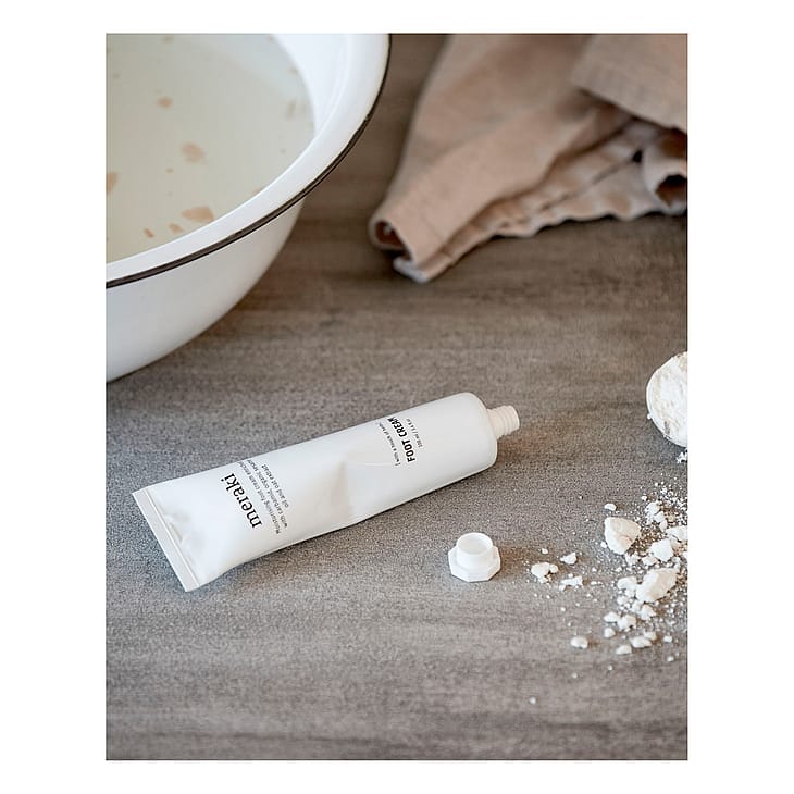 Brug Meraki fodcreme på rene, tørre fødder. Massér fødderne med en mængde creme, så den trænger godt ind i huden.