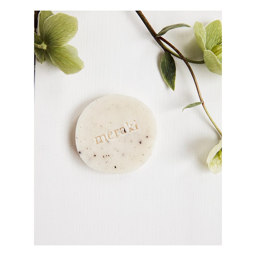 Denne lille. runde sæbebar med snor fra Meraki giver dine hænder en blid eksfoliering takket være en sesamscrub. Med essentielle olier fra grøn mynte, cedertræ og eukalyptus kan du nyde en let kølende og opkvikkende effekt, mens du bruger sæben. Med sin lille størrelse er sæben en fin værtindegave og ideel til gæstetoilettet.