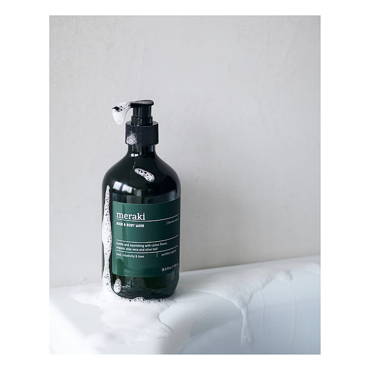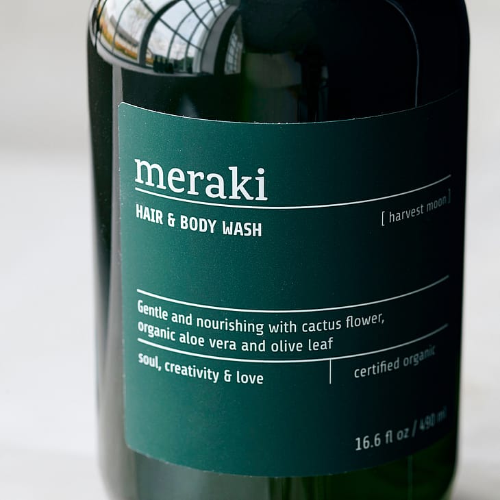 Den kombinerede Harvest Moon Hair & Body Wash er til dig, der gerne vil have en enklere rutine med færre produkter at forholde dig til. Meraki har tilført den aloe vera, olivenolie og ekstrakter fra kaktus, som alle fugter og nærer huden. Certificeret COSMOS økologisk af Ecocert.