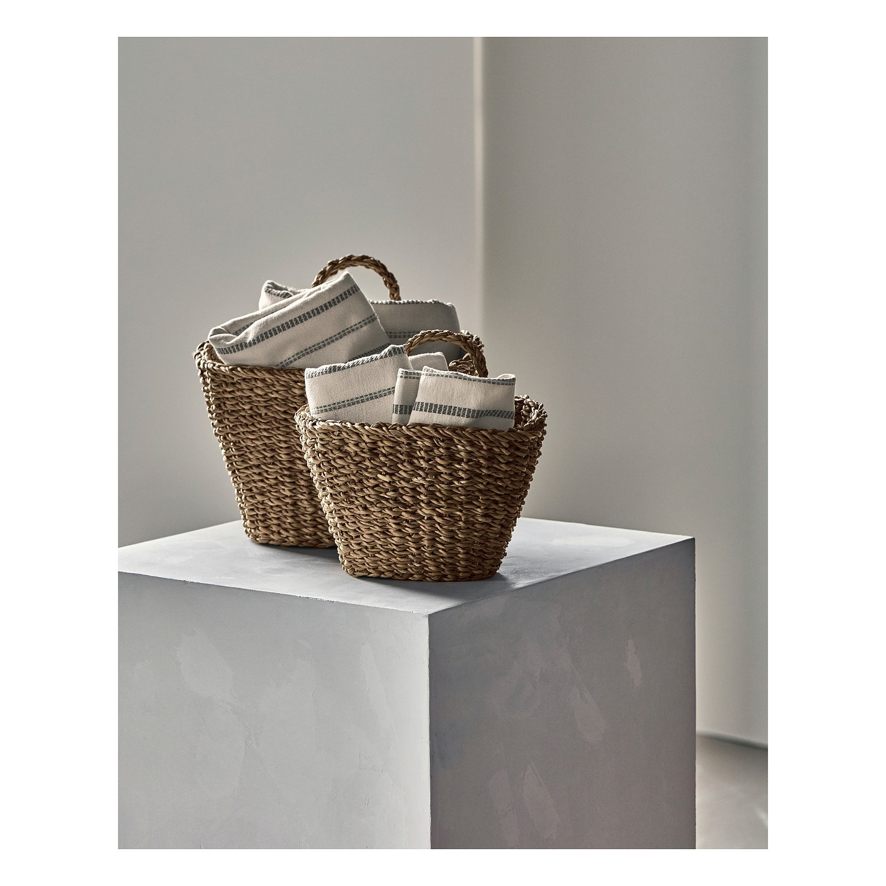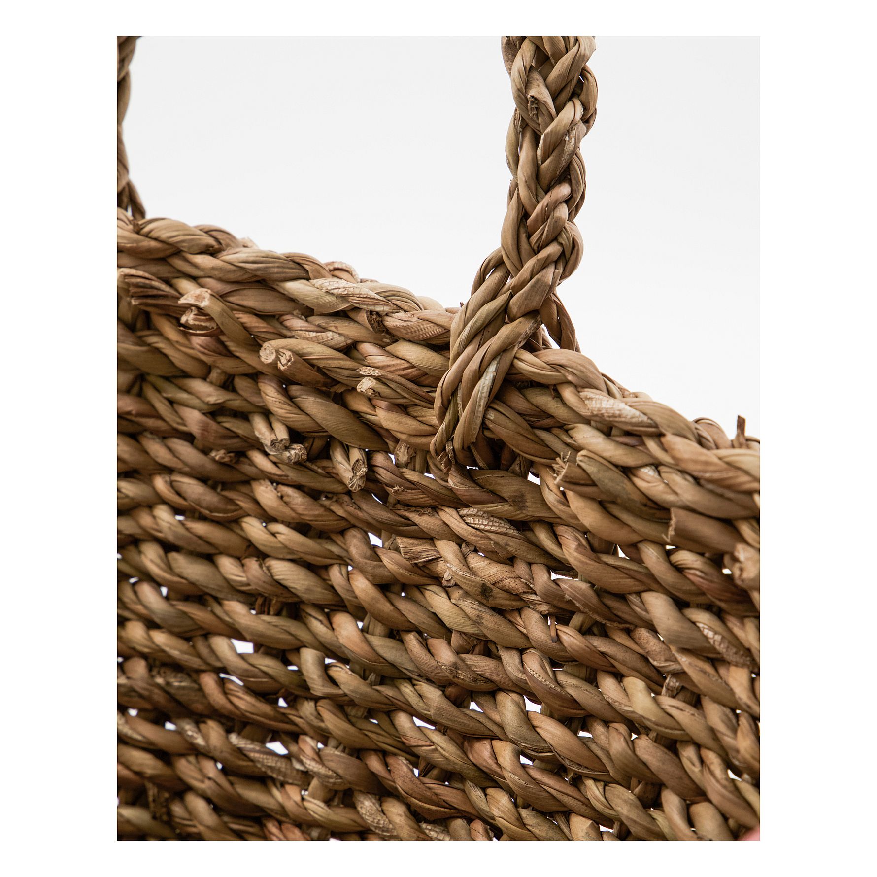 Håndflettede detaljer og praktiske hanke gør det let at hænge dem på knager i badeværelse, soveværelse eller køkken.