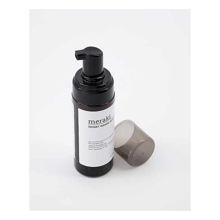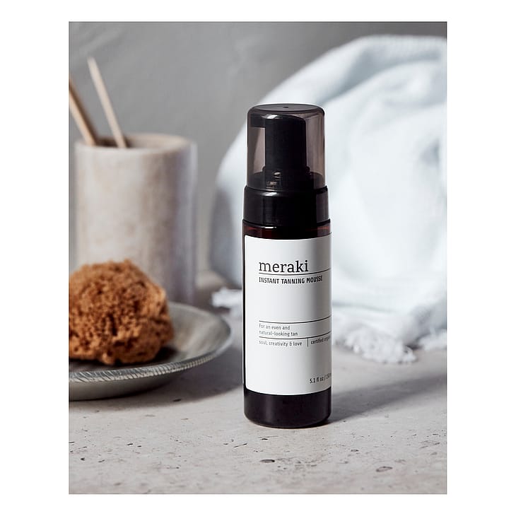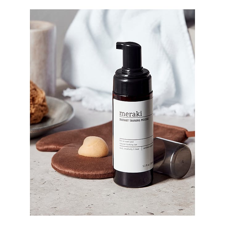 Få en jævn og naturlig sommerglød med denne instant selvbrunermousse fra Meraki. Moussen har en naturlig karamelfarve og er certificeret økologisk. Den farver øjeblikkeligt, og i løbet af 2-6 timer får du en smuk sommerkulør. Selvbrunermoussen indeholder aloe vera og glycerin, som gør din hud fugtig, blød og velplejet. For det bedste resultat skal du først rense huden med en eksfolieringshandske fra Meraki eller en bodyscrub. Derefter smører du creme på ekstra tørre hudområder såsom albuer og knæ. Påfør dernæst et jævnt lag mousse på huden og fordel det cirkulære bevægelser med Meraki fordelerhandsken. Hvis du glemmer at bruge handske, så husk at vaske hænderne grundigt efter brug. Farven vil gradvis forsvinde efter et par dage, men du kan forlænge den ved at påføre endnu et lag. Produktet er certificeret COSMOS økologisk af Ecocert.