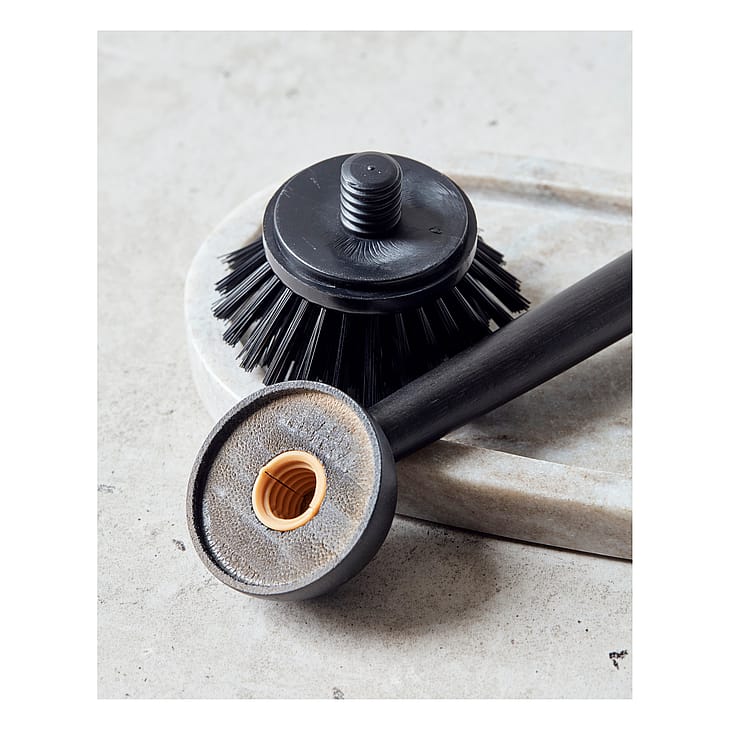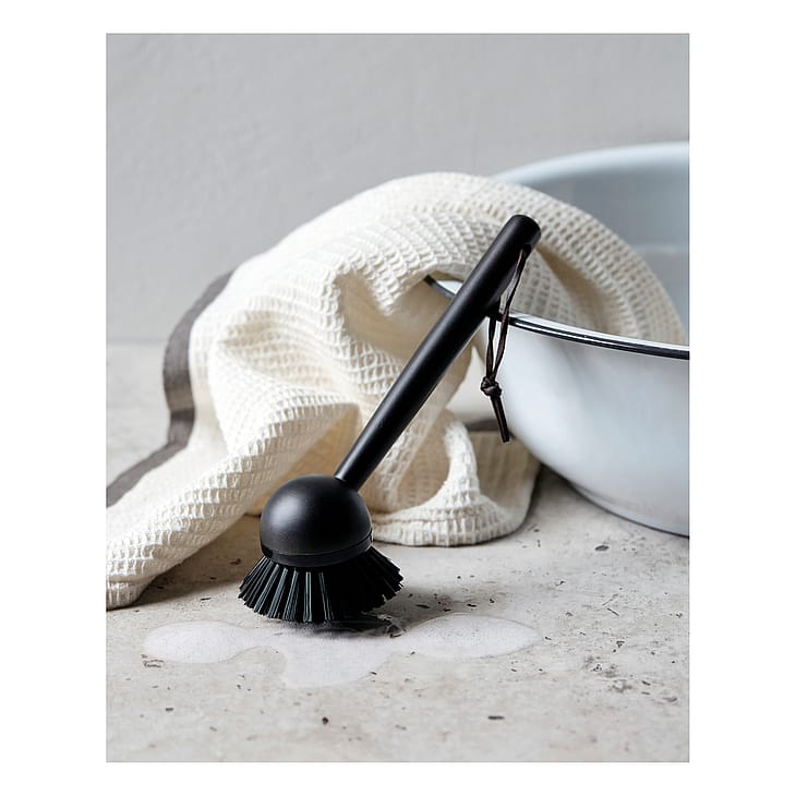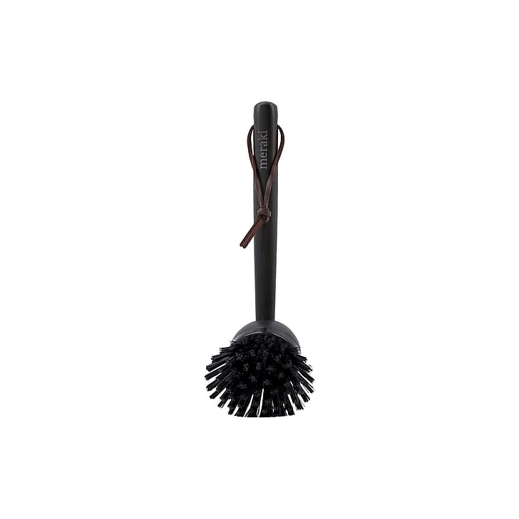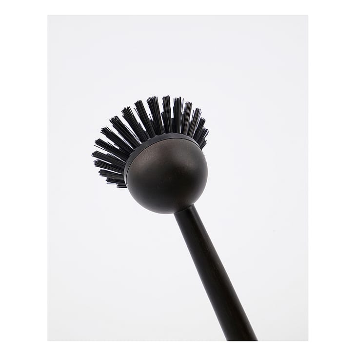 Flot opvaskebørste fra Meraki til dit køkken. Opvaskebørsten er lavet af bambus og er sortbejdset, hvilket fremhæver træets struktur. Skaftet ligger godt i hånden, mens børstehovedet kan udskiftes, så du kan beholde opvaskebørsten i længere tid (varenummer 304870043). Den er forsynet med en snor, så du nemt kan hænge den over vasken. Da børsten er sortbejdset, kan farven falme over tid.