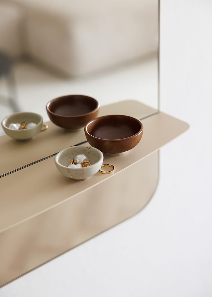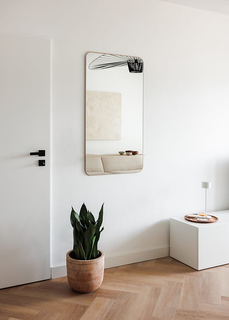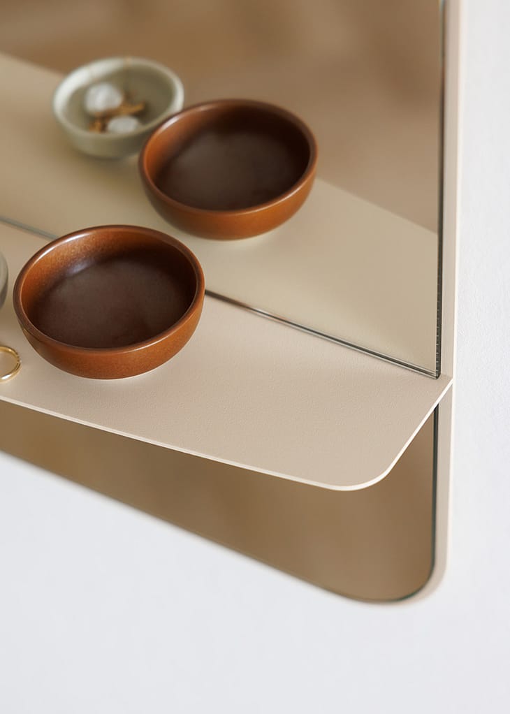 Rammen er udført i pulverlakeret metal med en fin, struktureret overflade, der giver et elegant look. Den beige farve tilføjer varme og blødhed, mens de afrundede hjørner understøtter et nutidigt designudtryk. Den forskudte spejloverflade giver spejlet en moderne karakter, som adskiller det fra traditionelle vægspejle.