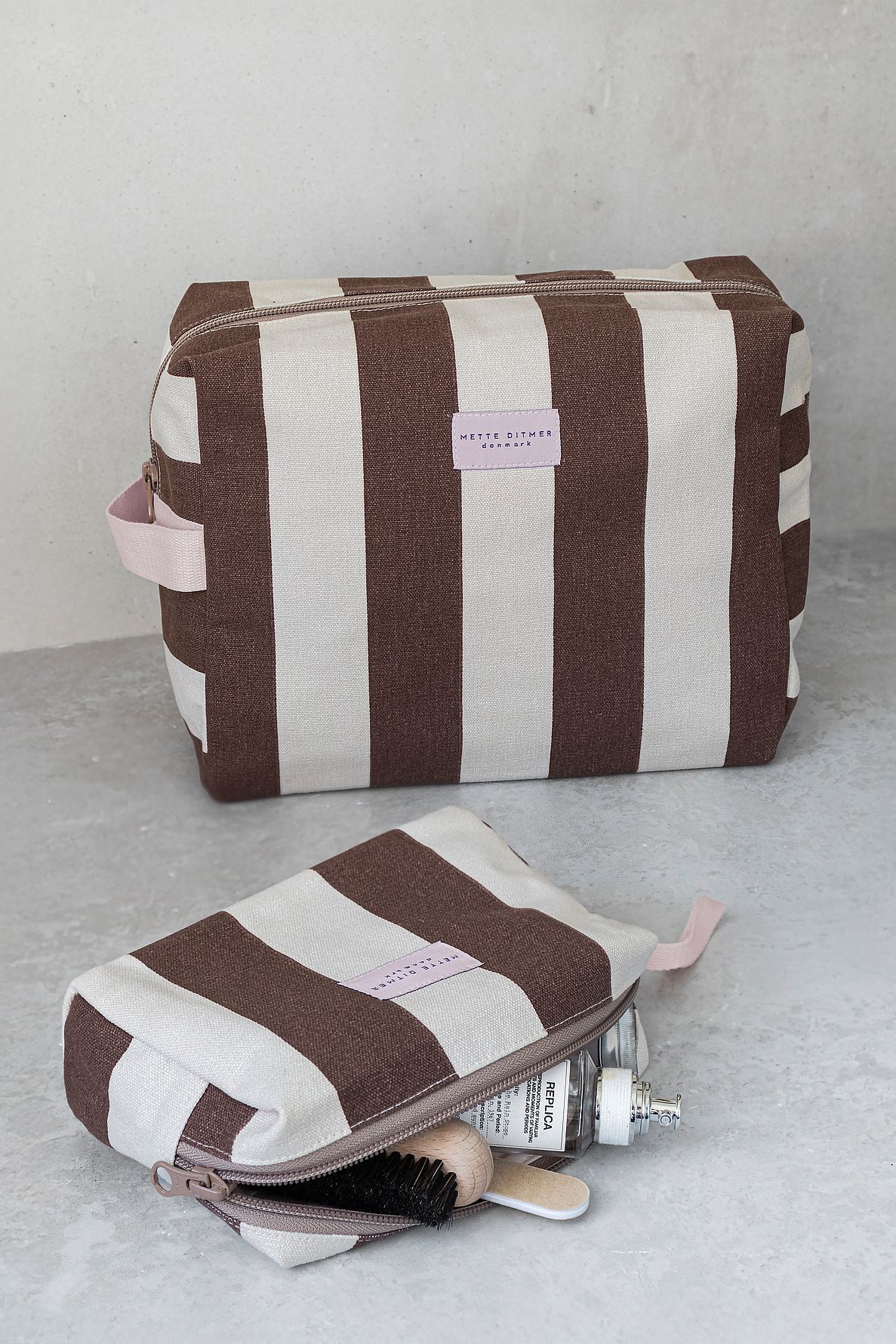 Den er syet i kraftig bomulds-canvas med klassiske brune striber på en sandgrå bund. En støvet lyserød strop og label giver pungen et fint farve-tvist og et legende udtryk.