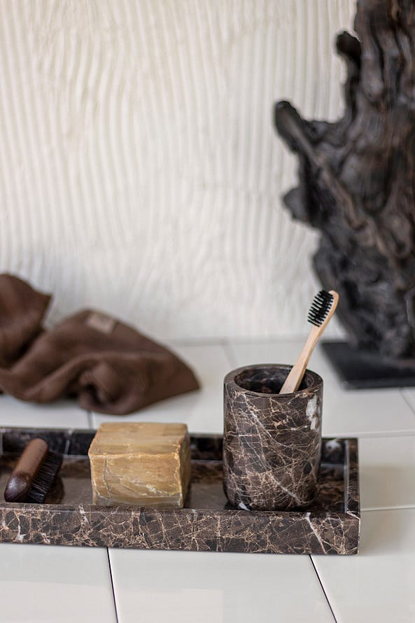 Meget fin tandbørsteholderJeg har 3 dele fra dette design. Tandbørste holderen er lidt en anden farve en de 2 andre, men med natursten kan man ikke være sikker på at de er ens. Er godt tilfreds.