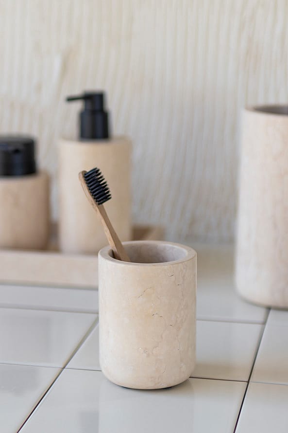 Meget fin tandbørsteholderJeg har 3 dele fra dette design. Tandbørste holderen er lidt en anden farve en de 2 andre, men med natursten kan man ikke være sikker på at de er ens. Er godt tilfreds.