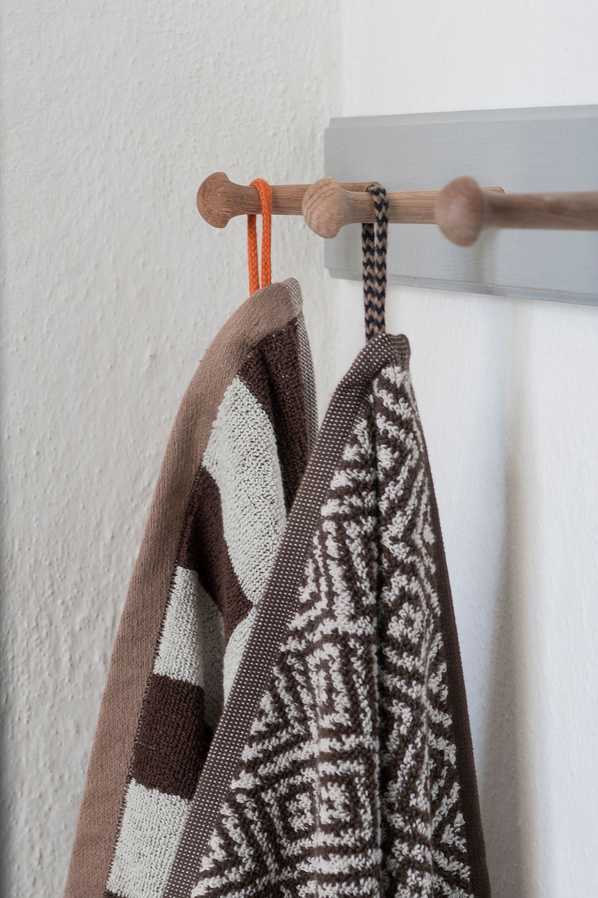 Med sine mørkegrå og off-white farver kombineret med en lysebrun kant er håndklædet både stilfuldt og funktionelt. De velovervejede detaljer, som den orange strop og label, tilføjer et ekstra strejf af kant til din badeværelsesindretning.
