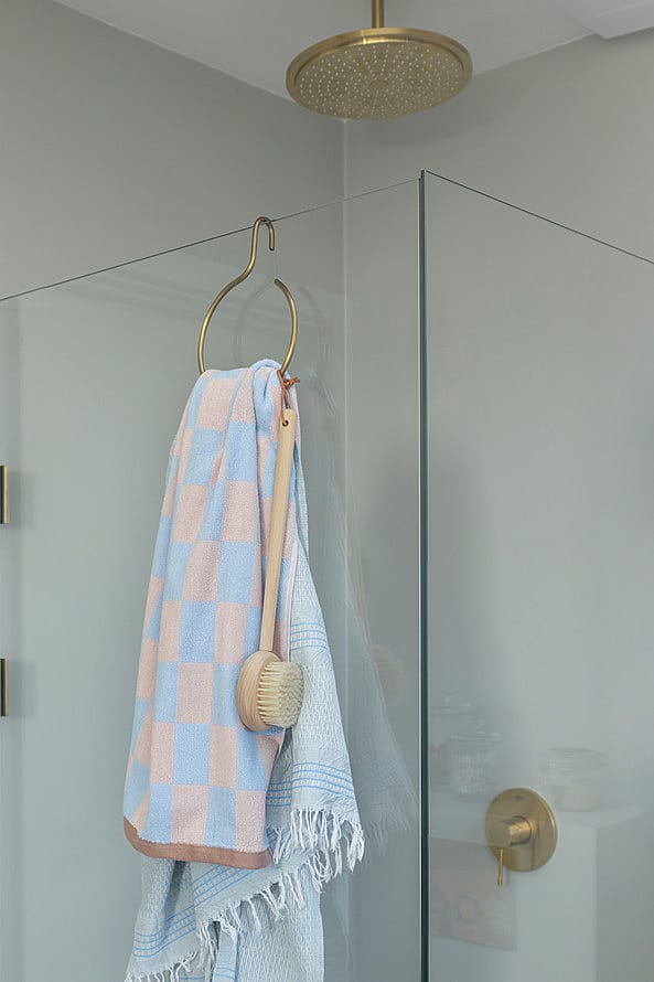 Når håndklæderne ikke er i brug, ser de fantastiske ud på et stativ eller i en åben kurv. Mix og match RETRO håndklæderne med farvestrålende badtilbehør fra Mette Ditmer.
