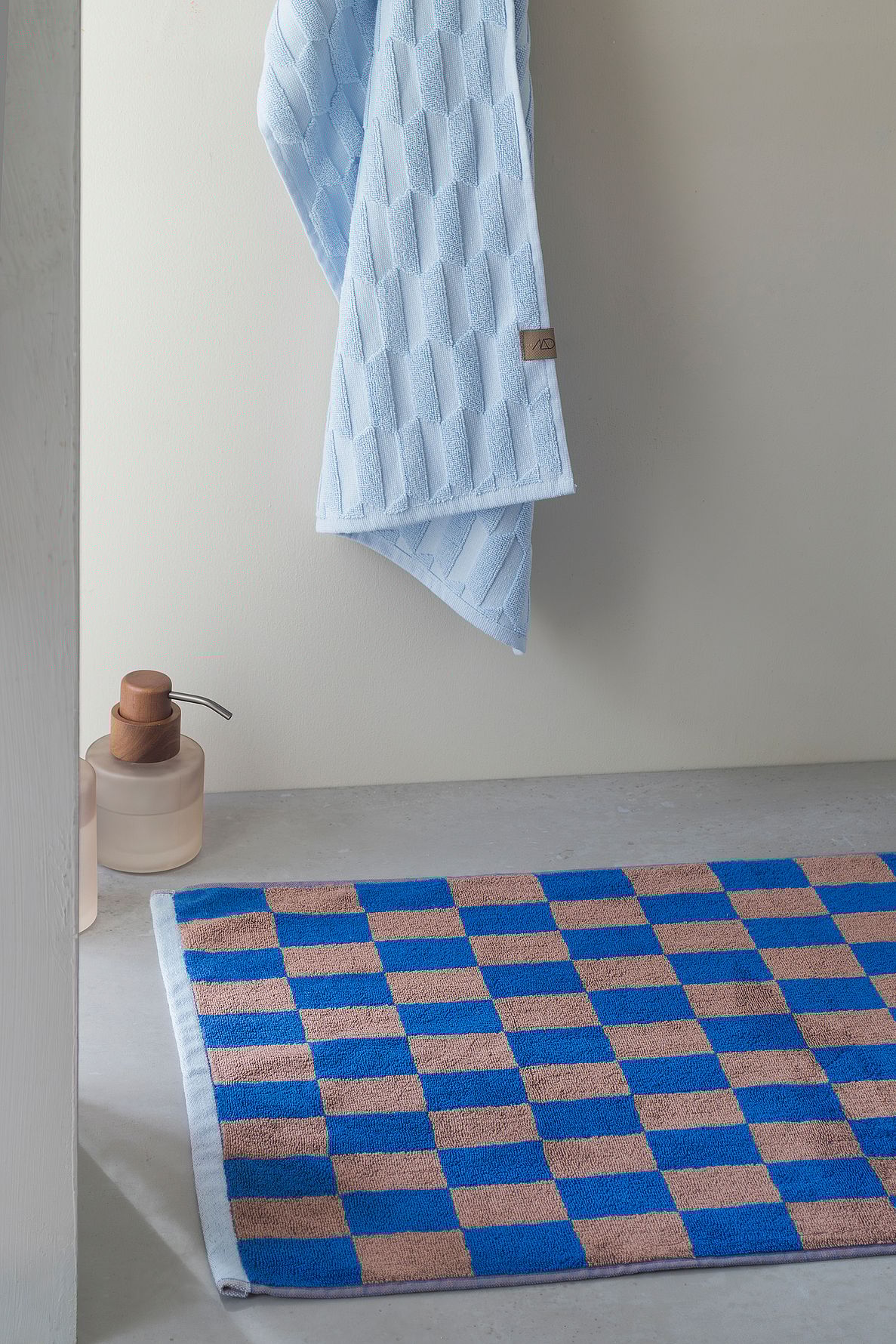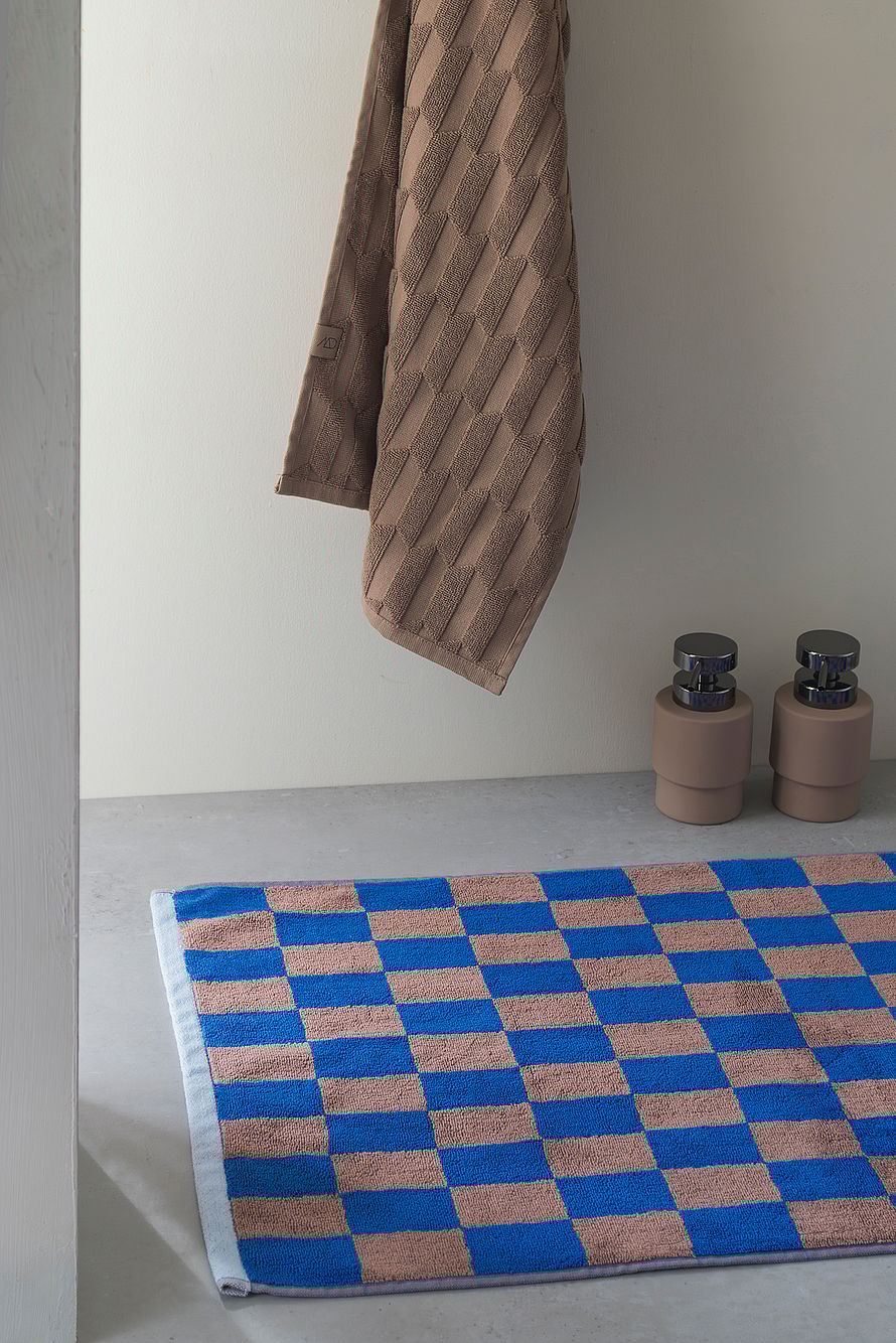 Bademåtten har en klar koboltblå og cognacfarvet ternet kombination, der tilføjer et moderne præg til enhver indretning.
