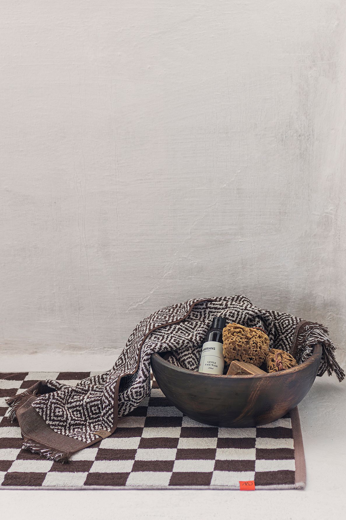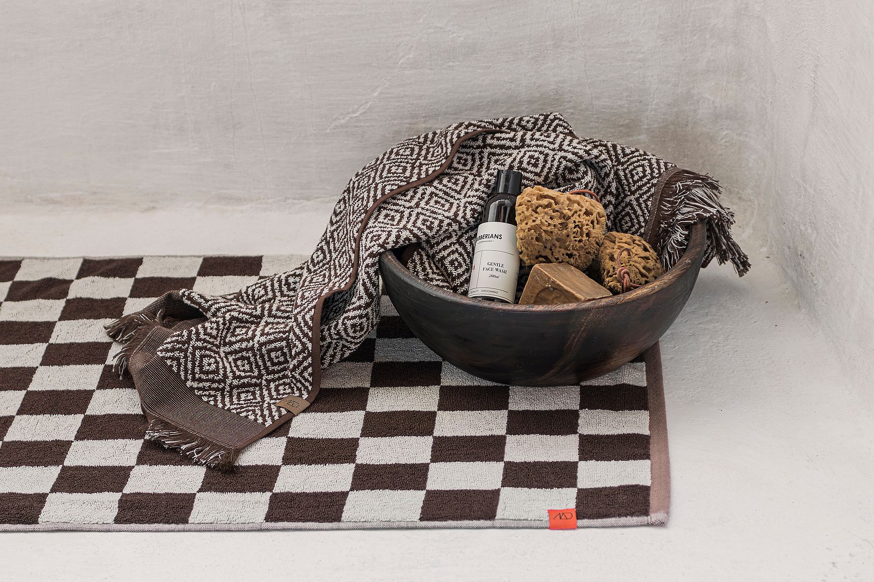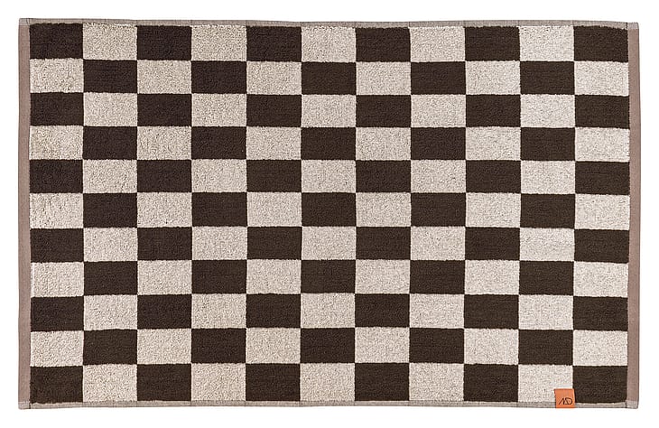 Denne bademåtte byder på et sofistikeret grafisk design i brun og off-white, komplet med en lys brun kant og en karakteristisk orange strop og label.