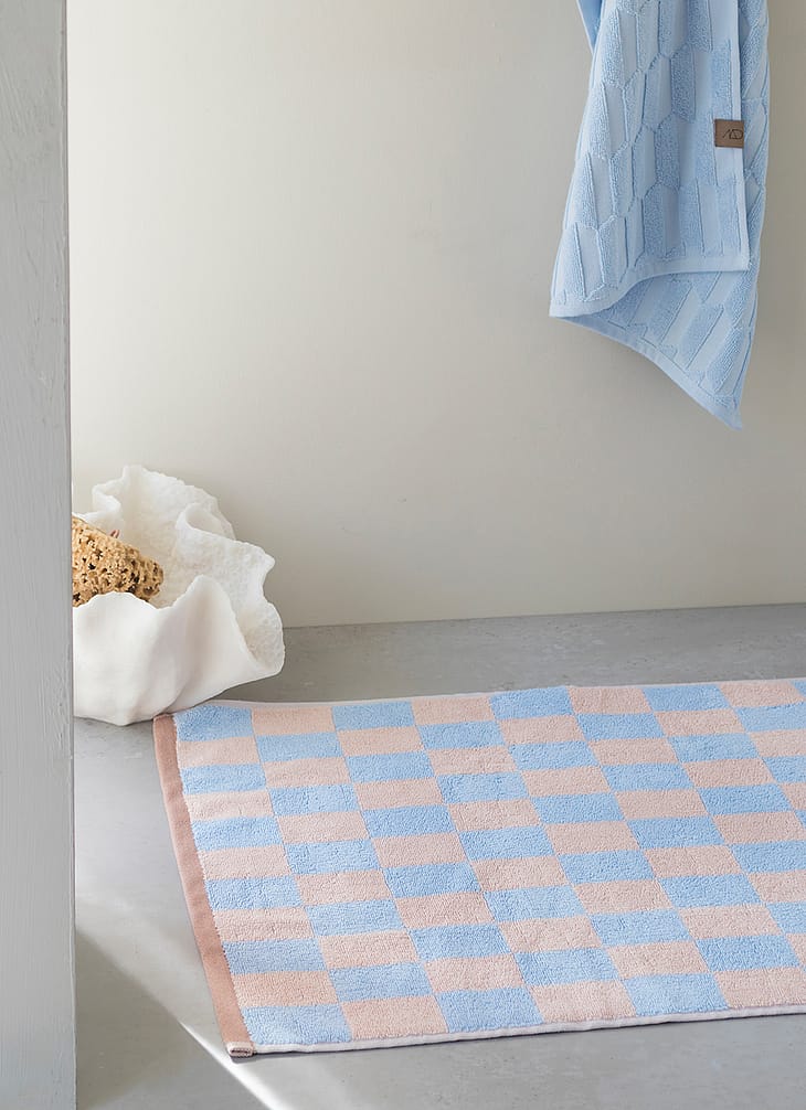 Denne smukke bademåtte har en iøjnefaldende lyseblå og rosa ternet farvekombination, der bringer liv til enhver badeværelsesindretning.
