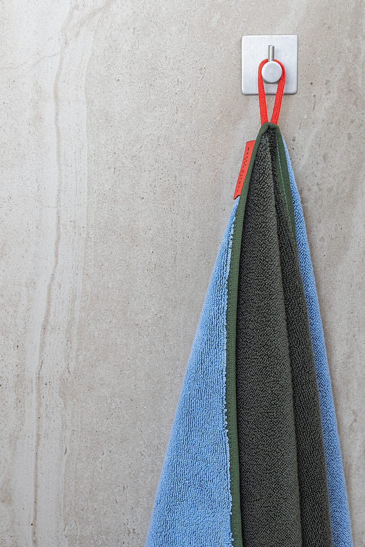 Det rolige design rummer en subtil leg med farver, der gør håndklædet visuelt interessant uden at virke larmende.