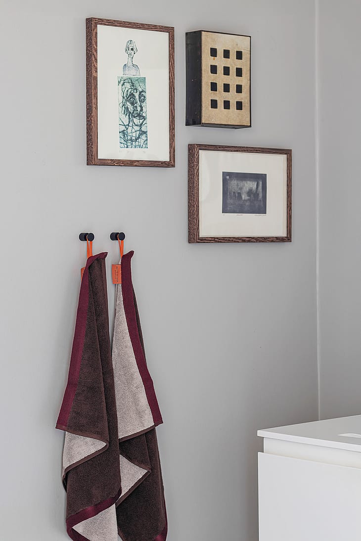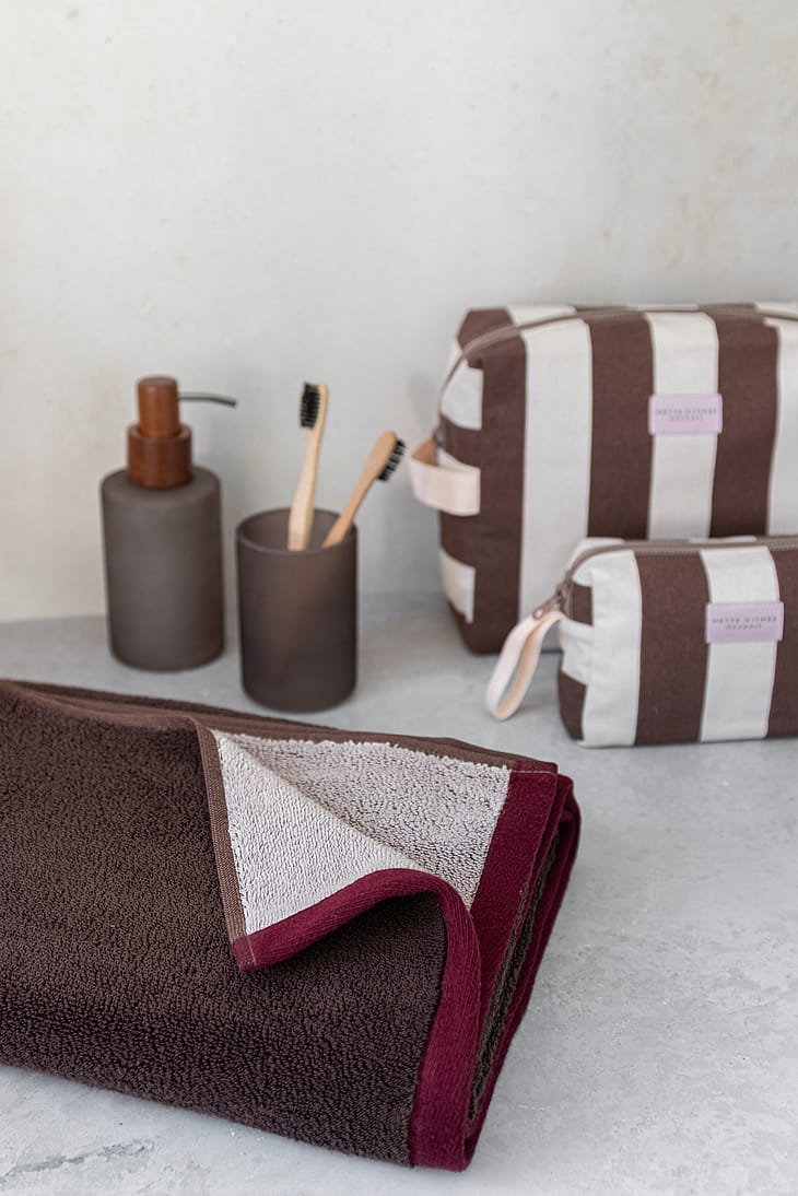 En vinrød bort skaber en balanceret kontrast og binder farverne sammen. Det rolige design rummer en subtil leg med farver, der gør håndklædet visuelt interessant uden at virke larmende.