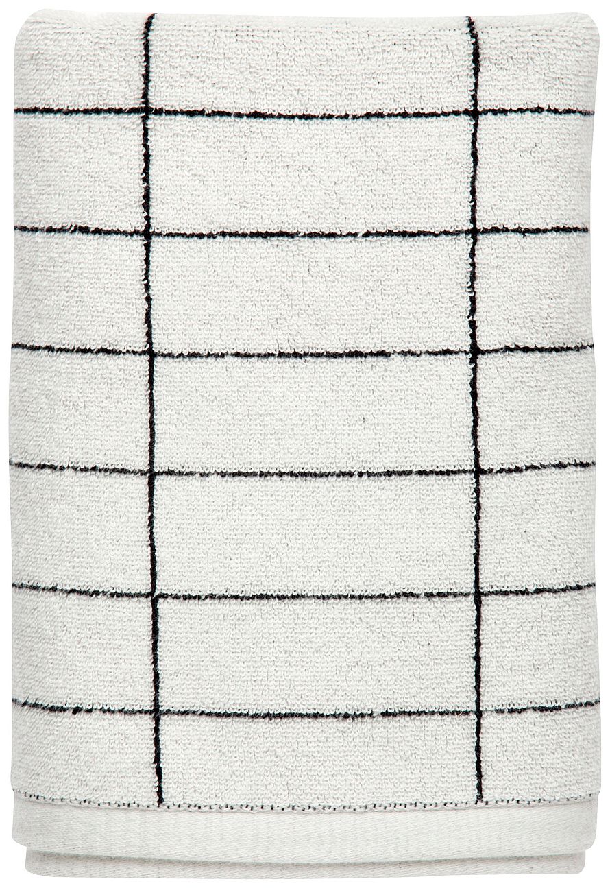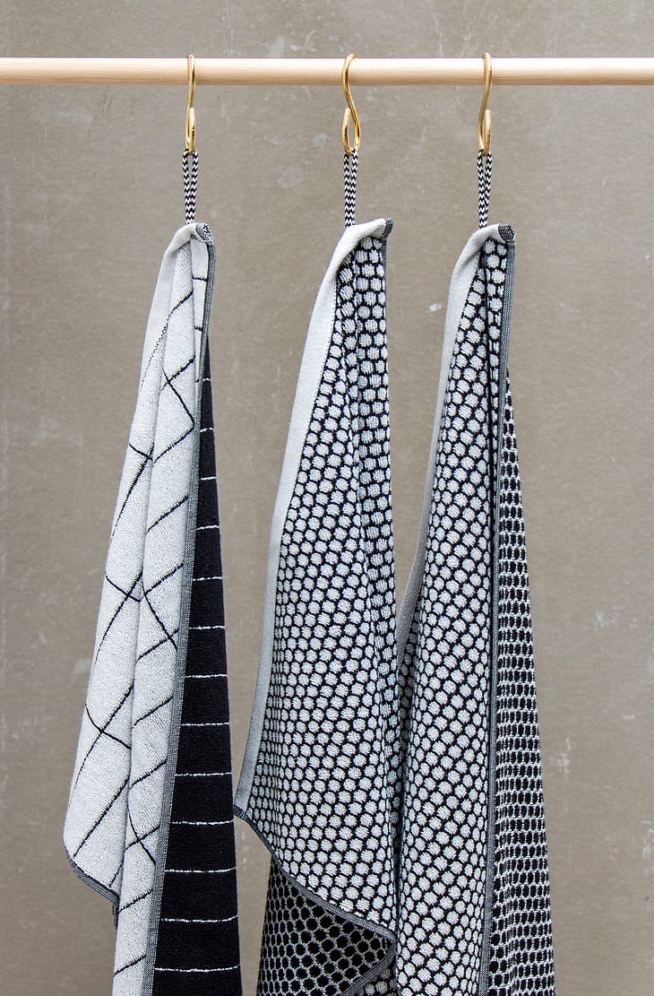 Håndklæderne TILE STONE har et enkelt design med spinkle sort/hvide striber, der henleder tankerne på et klassisk flisemønster.