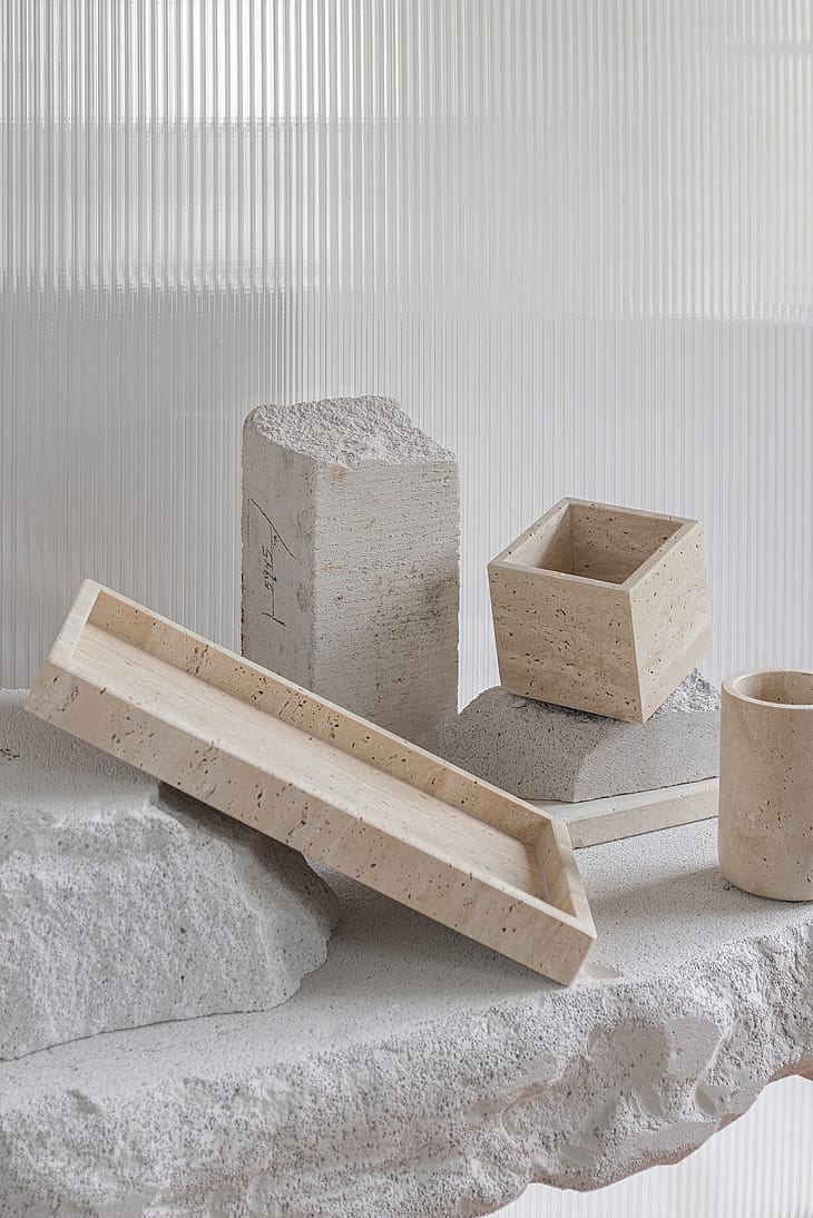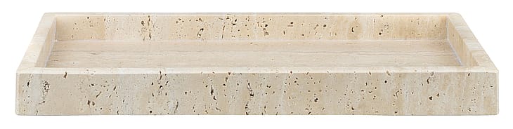 TRAVERTIN-bakken er en smuk og funktionel bakke fremstillet af den ikoniske travertinsten, kendt for sin karakteristiske fordybninger, naturlige struktur og jordnære toner.