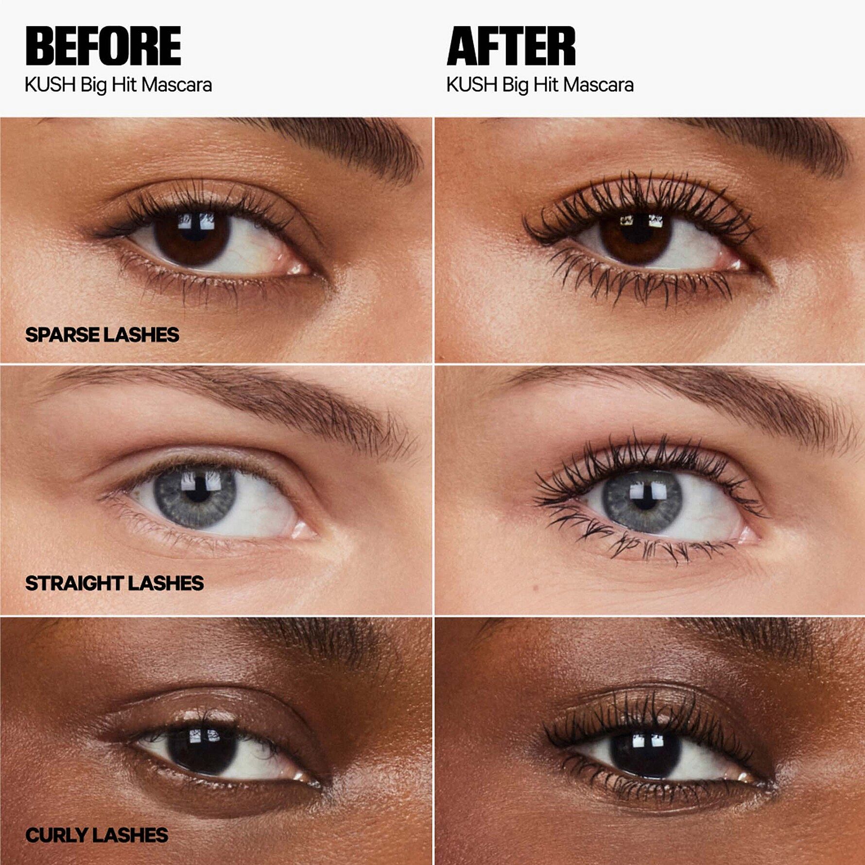 KUSH Big Hit Volumizing MascaraKUSH Big Hit Volumizing Mascara er en ren, bygbar volumenmascara, der fremhæver hver vippe for intensivt fyldigere og længere vipper. Den flager, klumper eller smitter ikke af i op til 12 timer. Testet af øjenlæger.