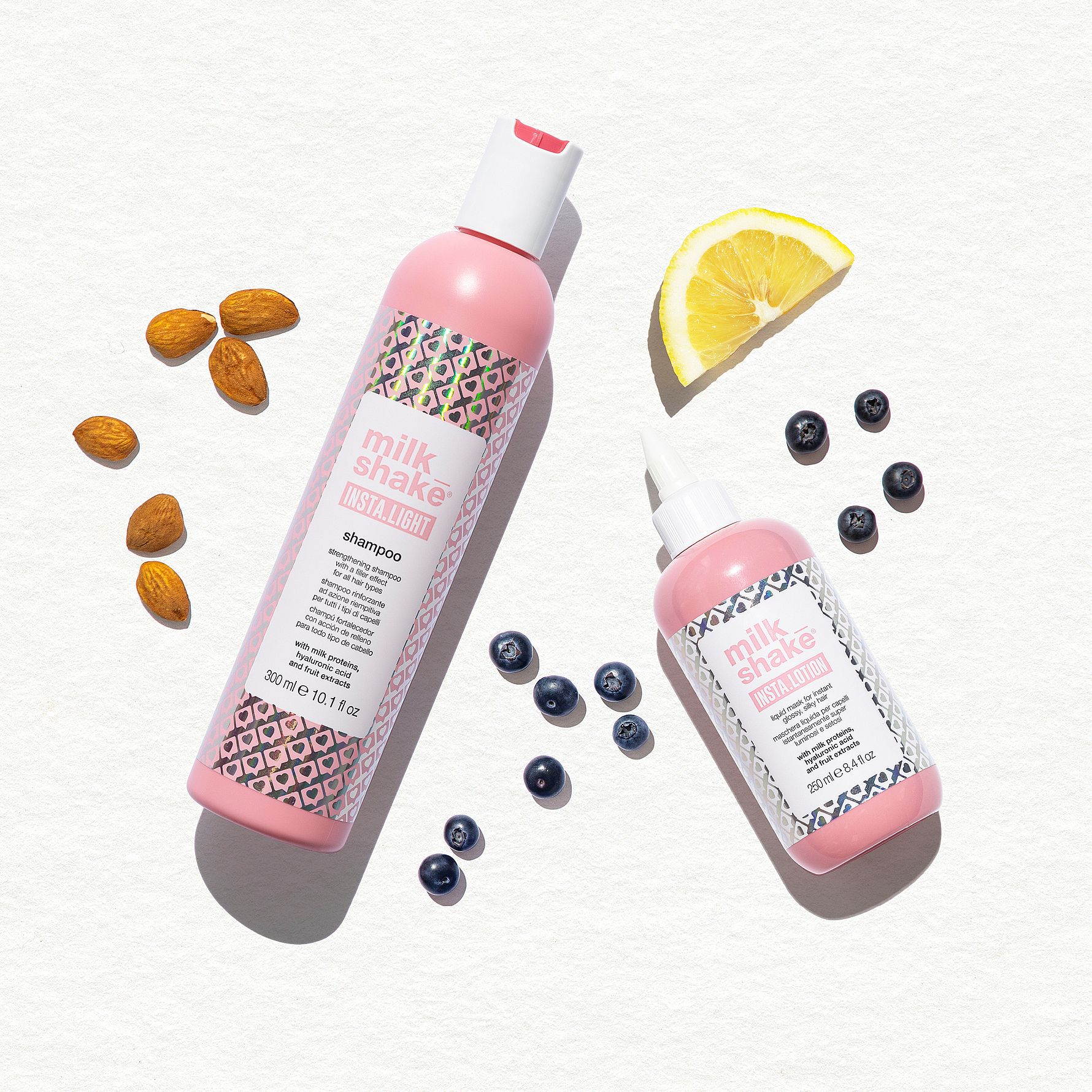 Med mælkeproteiner, hyaluronsyre og citronogblåbærekstrakter har den en fyldig effekt på håret med en øjeblikkeliggenoplivende virkning.
