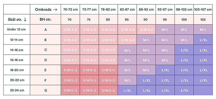Find din omkreds ved at trække målebåndet stramt omkring torsoen lige under barmen. Skålen udregnes ved at trække dit mål under barmen fra det antal cm, som du måler omkring det bredeste sted på brystet.