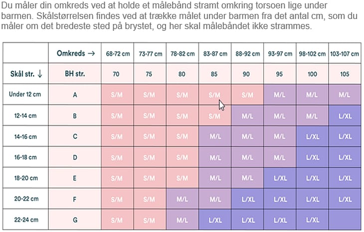 Skålen udregnes ved at trække dit mål under barmen fra det antal cm, som du måler omkring det bredeste sted på brystet.