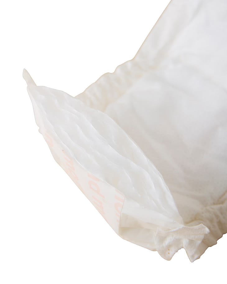 Specifikationerli>Materiale: Toplag: 100% certificeret økologisk bomuld, Absorberende kerne: 100% certificeret økologisk bomuld, Underside: bionedbrydelig biopolymer af majsstivelse- Indeholder hverken blegemiddel, latex, parfume eller farvestoffer