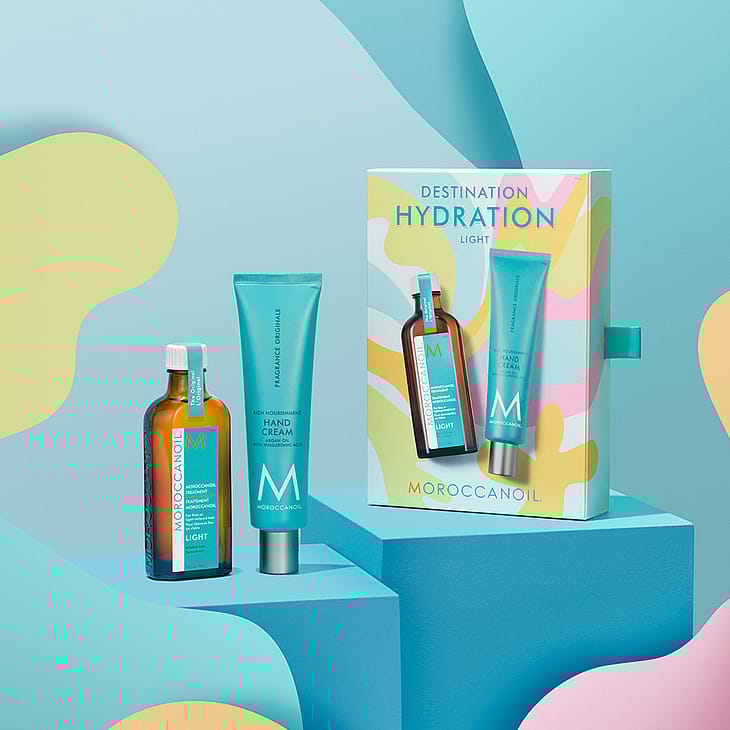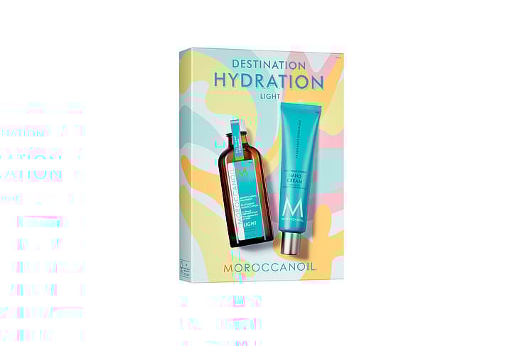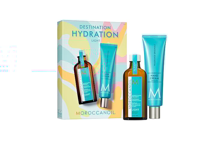 Moroccanoil Destination Hydration Original er en fugtgivende duo bestående af Moroccanoils Best Sellers; Treatment Original og Hand Cream. Begge produkter er beriget med nærende arganolie, som er rig på E-vitamin, essentielle fedtsyrer og antioxidanter, der tilfører intensiv fugt og dybdegående pleje til håret samt huden. Begge produkter er ligeledes med Moroccanoils ikoniske signaturduft ”Fragrance Originale”, som er en blanding af krydret rav og søde blomsternoter. Én duft, der henleder til det eksotiske middelhavsområde og vækker sanserne.