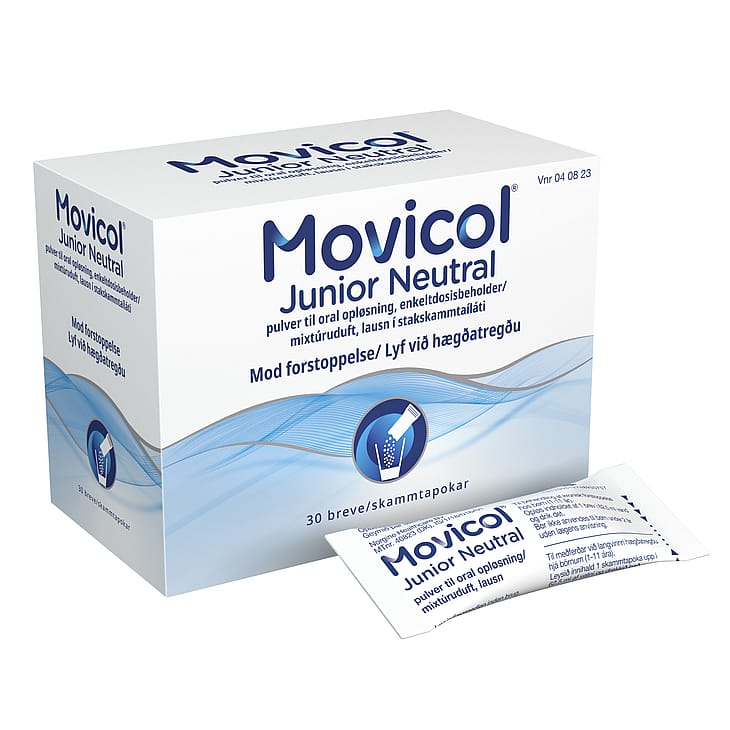 MOVICOL® Junior Neutral, pulver til oral opløsning, 30 stk. Macrogol 3350, natriumchlorid, natriumhydrogencarbonat, kaliumchlorid.