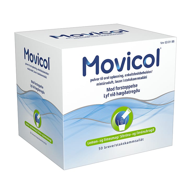 MOVICOL® pulver til oral opløsning, lemon/lime smag. Middel til behandling af kronisk forstoppelse. Det kan endvidere anvendes ved indeklemt afføring verificeret af en læge. Fra 12 år.