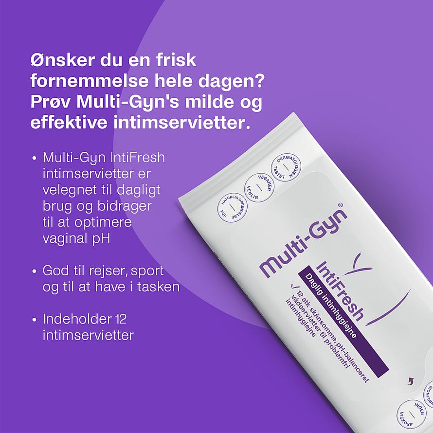 Multi-Gyn IntiFresh er intimservietter til brug for en mild intimhygiejne og en frisk fornemmelse. Intimservietterne virker både rengørende, opfriskende og fjerner eventuel lugt. Multi-Gyn IntiFresh indeholder det naturlige og patenterede 2QR-kompleks, og er desuden 100% bio-nedbrydelige.