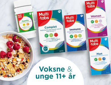 En daglig multivitamin- og mineraltablet tilpasset voksne og unge fra 11 år i en almen daglig variant eller en specifik sammensætning til enten kvinder eller mænd. En Complet 3-i-1 variant, kombineret af vitaminer, mineraler og omega-3. Immuno der indeholder vitaminer, mineraler og mælkesyrebakterier, specielt sammensat til at støtte immunforsvaret*.