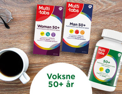 En daglig multivitamin- og mineraltablet tilpasset voksne 50+ i en almen daglig variant eller en specifik sammensætning til enten kvinder eller mænd 50+. Multi-tabs’ 50+ produkter indeholder bla. ekstra vitamin D og calcium, som bidrager til at vedligeholde normale knogler.
