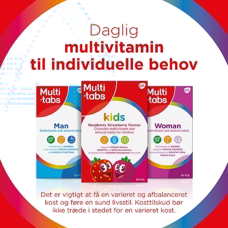 Multi-tabs Kids er en del af Multi-tabs børneserie. Serien indeholder desuden en tygbar multivitamin med calcium (kalk) og et velsmagende omega-3 fiskeolieprodukt.
