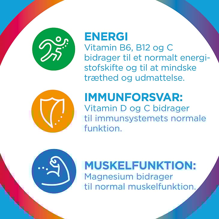 Multi-tabs Man indeholder vitamin D og C som bidrager til immunsystemets normale funktion. - Muskelfunktionen: