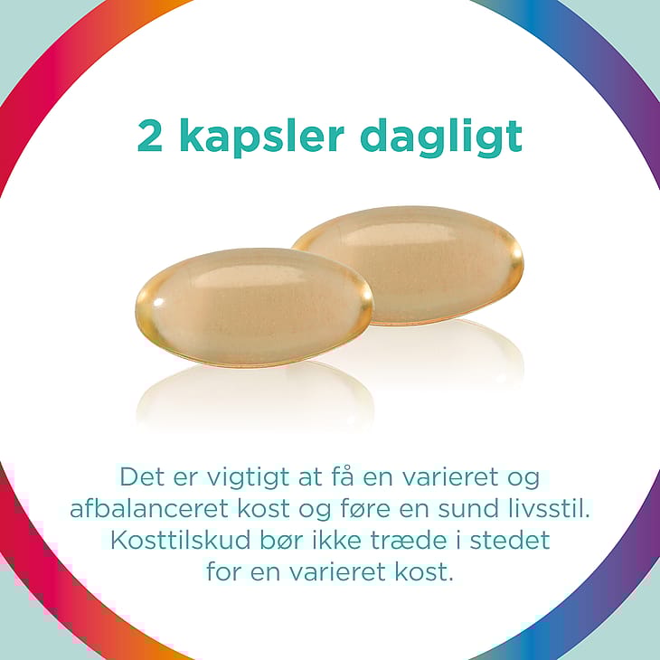 Kosttilskud. Kapslen bør indtages i forbindelse med et måltid. Anbefalet daglig dosis bør ikke overskrides. Det er vigtigt at få en varieret og afbalanceret kost og føre en sund livsstil. Kosttilskud bør ikke træde i stedet for en varieret kost. Opbevares uden for små børns rækkevidde, tørt og ved stuetemperatur (under 25°C).