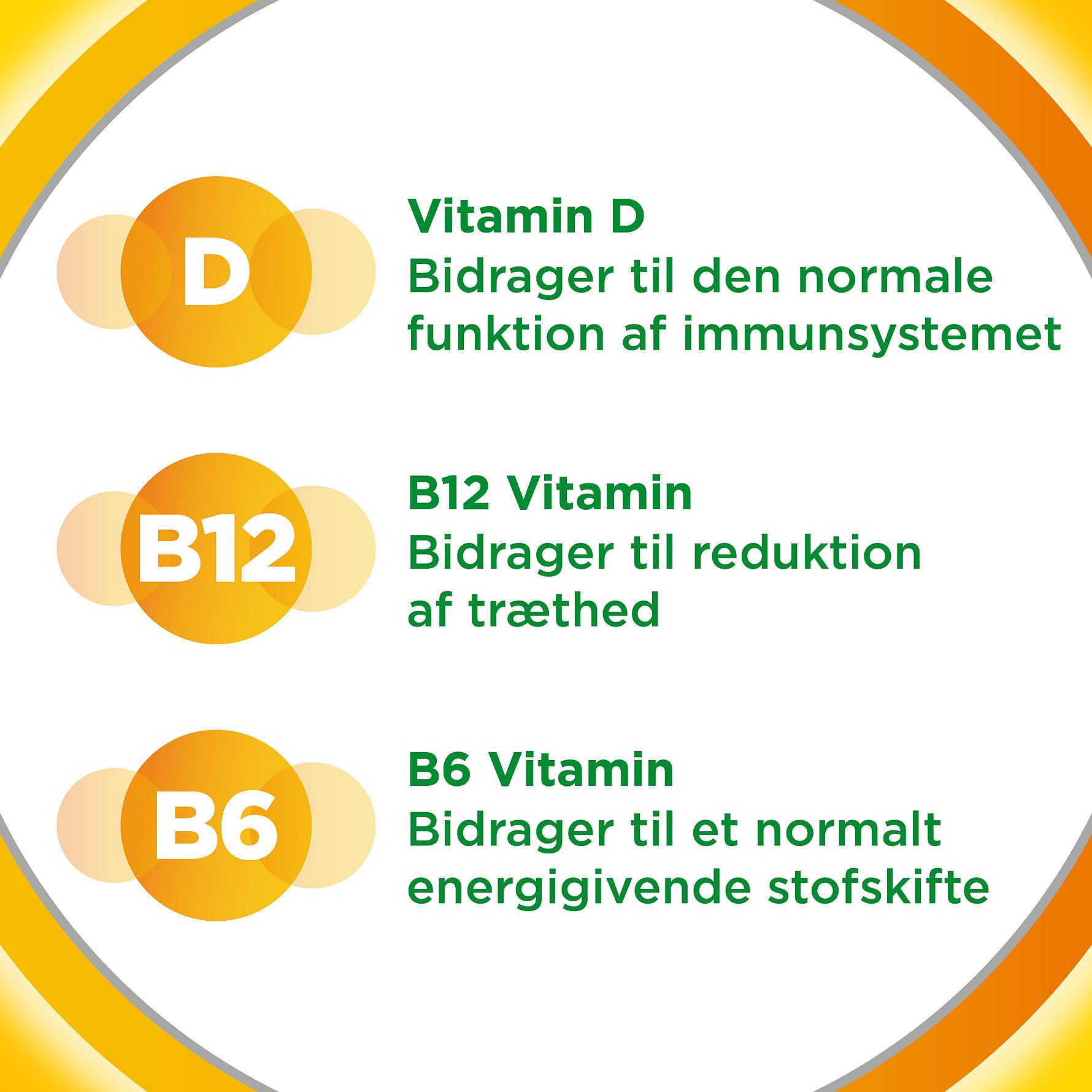 calcium/kalcium (dicalciumphosphat/dikalciumfosfat), magnesium (magnesiumoxid), calcium/kalcium (calciumcarbonat/kalciumkarbonat), fyldemidler/fyllnadsmedel (mikrokrystallinsk cellulose/mikrokristallin cellulosa), vitamin C (L-ascorbinsyre/L-askorbinsyra), antiklumpningsmidler/klumpförebyggande medel (tværbunden natriumcarboxymethylcellulose/tvärbunden natriumkarboximetylcellulosa, magnesiumsalte af fedtsyrer/magnesiumsalter av fettsyror, siliciumdioxid/kiseldioxid, talkum/talk), vitamin E (DL-alfa-tocopherylacetat/DL-alfa-tokoferylacetat), niacin (nikotinamid), overfladebehandlingsmidler/ytbehandlingsmedel (hydroxypropylmethylcellulose/hydroxipropylmetylcellulosa, polydextrose/polydextros), pantothensyre/pantotensyra (calcium-D-pantothenat/kalcium-D-pantotenat), maltodextrin, jern/järn (ferrofumarat/järnfumarat), zink (zinkoxid), vitamin A (betacaroten/betakaroten), vitamin B6 (pyridoxinhydrochlorid/pyridoxinhydroklorid), vitamin B1 (thiaminmononitrat/tiaminmononitrat), vitamin B2 (riboflavin), vegetabilsk olie/vegetabilisk olja (kokos, palmekerne/palmkärna), kobber/koppar (kobbersulfat/kopparsulfat), vitamin A (retinylacetat), folsyre/folsyra (pteroylmonoglutaminsyre/pteroylmonoglutaminsyra), chrom/krom (chrom(III)chlorid/krom(III)klorid), molybdæn/molybden (natriummolybdat), jod (kaliumjodid), selen (natriumselenat), biotin (D-biotin), vitamin K (phylloquinon/fyllokinon), vitamin D (cholecalciferol/kolekalciferol), vitamin B12 (cyanocobalamin/cyanokobalamin), farve/färgämne (calciumcarbonat/kalciumkarbonat, indigotin).