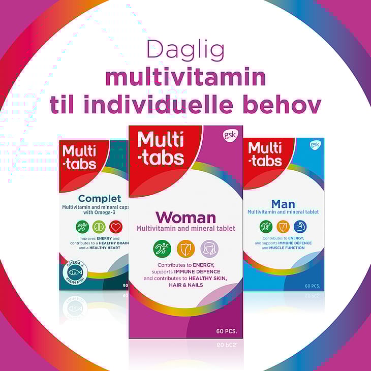 - reduktion af træthed: Multi-tabs Woman indeholder vitamin B6, B12 og C som bidrager til et normalt energistofskifte og til at mindske træthed og udmattelse.