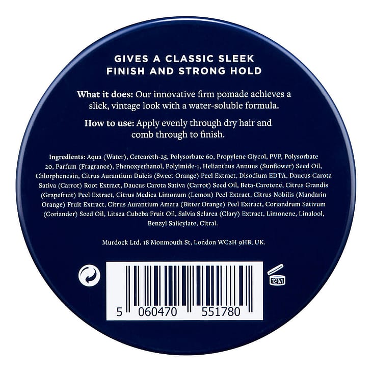 Murdock Londons Vintage Pomade er en vandbaseret pomade, der giver et klassisk, ultra-glat look med stærkt hold – ideel til frisurer som quiffs og pompadours.