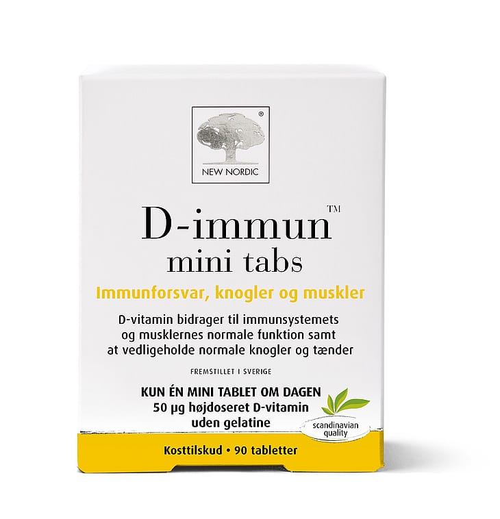 D-vitamin kan dannes i huden ved hjælp af sollys. Vitaminet fungerer som et hormon og bidrager til en normal optagelse og udnyttelse af kalcium og fosfors omsætning. D-immun™ mini tabs indeholder 50 µg D3-vitamin i en olieholdig tablet (havtornolie). Minitabletterne er nemme at sluge. D-vitamin støtter immunforsvaret samt vedligeholdelsen af tænder, knogler og muskler
