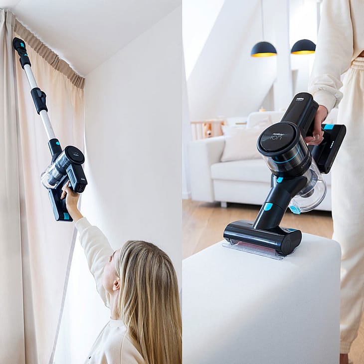 Med sin 2-i-1 funktionalitet fungerer den som både stangstøvsuger og håndholdt støvsuger, hvilket giver maksimal fleksibilitet til rengøring af alle overflader.