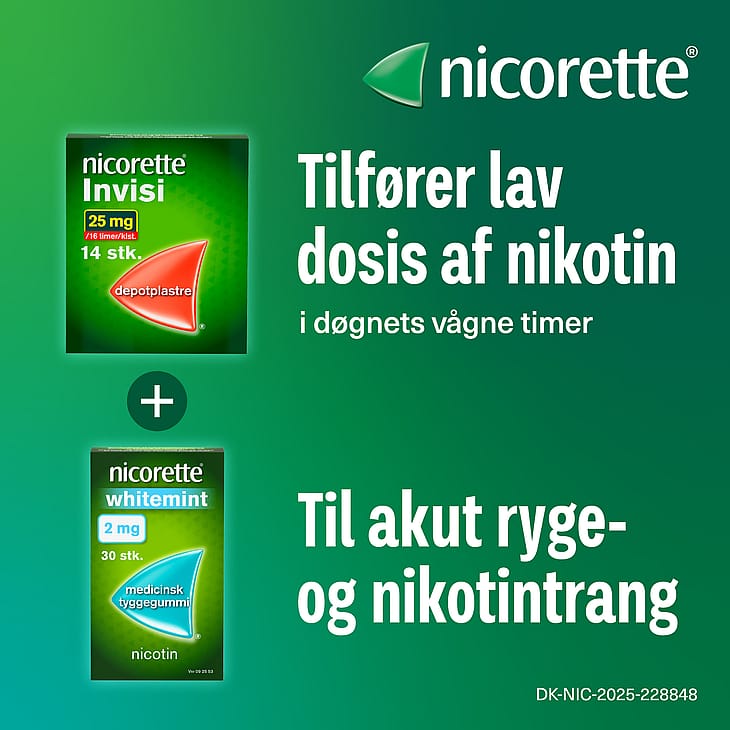 Nicorette® bruges til beh. af tobaksafhængighed gn. lindring af nikotintrang og abstinenssymptomer. Anb. brug max. 6-12 mnd. Må ikke bruges ved overfølsomhed overfor indholdsstofferne. Bør bruges med forsigtighed af personer med sukkersyge, tandprotese (tyggegummi), sensitiv/betændt hud/eksem (plaster). Nikotindoser, som en voksen ryger tolererer, kan give forgiftningssymptomer eller være dødelig hos små børn. Bør ikke bruges af gravide/ammende uden lægens anb. eller til børn u. 15 år. Risikoen bør dog afvejes over for fortsat rygning. Bivirkninger: Nældefeber, hævelse af ansigt, tuge eller svælg, vejrtrækningsbesvær, besvær med at synke, Kvalme, ømhed og irritation i mund/hals eller tunge, ændringer i smagssansen, kulde, varme, snurrende, prikkende fornemmelse i huden, træthed, opkastning, diarré, hovedpine, hoste, hikke. De fleste forekommer i løbet af de første 3-4 uger af behandlingen. Mundsår kan forekomme efter rygeophøret. Svimmelhed, hovedpine, søvnløshed, vrede, angst og rastløshed kan skyldes rygeophøret. Tyggegummiet kan i sjældne tilfælde beskadige tandproteser. Ved for hurtig tygning kan der forekomme irritation i halsen, svimmelhed, utilpashed, hikke, flatulens og mave-gener. Sugetablet-, mundspray- og inhalatorbrugere kan få hoste og irritation i mundhule og hals de første dage, og i løbet af de første 2 dage kan næsespraybrugere opleve næseblod, løbende næse, vand i øjnene og hoste. Hyppighed og sværhedsgrad klinger af ved fortsat brug.Nicorette Whitemint, Fruitmint, Freshmint, Classic. Medicinsk tyggegummi, 2 mg eller 4 mg nikotin. Dosering: Bruges ved rygetrang. Brug 4 mg, hvis du er vant til at ryge > 20 cig. dgl. eller > 6 i rygeafvænningstest score ellers 2 mg. Maks. 24 stk. dgl. Ved rygestop: Hold helt op med at ryge. Brug tyggegummi i mindst 3 mdr. med fuld dosis, før forbruget langsomt nedtrappes og afsluttes, typisk efter 6 mdr. Ved rygereduktion: Bruges ved rygetrang for at forlænge de røgfri intervaller mest muligt. Du bør have reduceret cigaretforbruget og indledt et totalt rygestop inden 6 mdr. Søg faglig rådgivning, hvis et seriøst rygestop ikke er forsøgt inden 9 mdr. Tyggeteknik: Tyg langsomt og lad tyggegummiet hvile i munden ind imellem. Pakninger: 30 stk., 105 stk. og 210 stk. 2018jan 2022/MNI