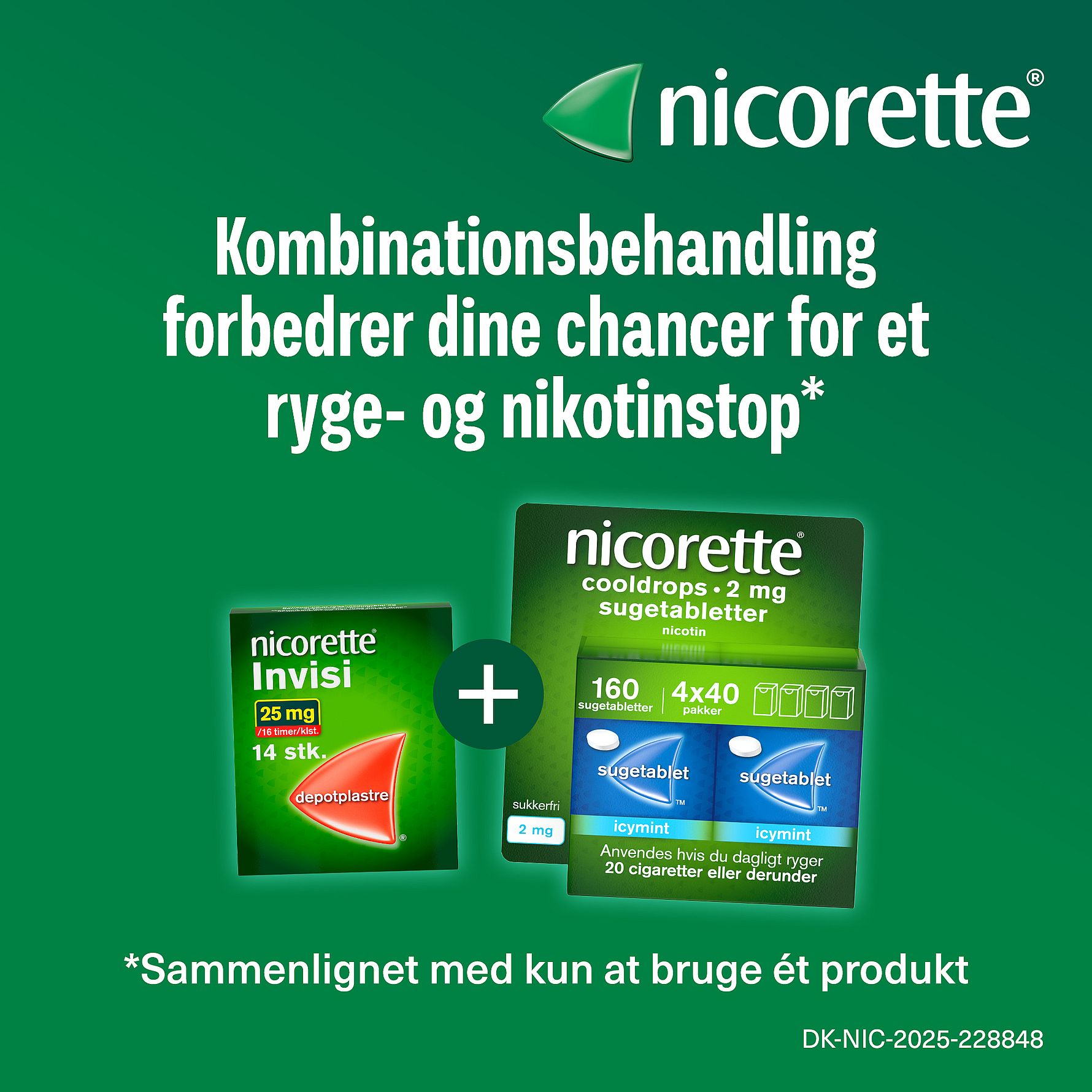 Nicorette Cooldrops & Fruit SugetabletterSugetablet (nicotin), 2 mg og 4 mg sugetabletter til behandling af tobaksafhængighed gennem lindring af nicotintrang og abstinenssymptomer og rygetrang. Anb. brug højst 9 måneder. Må ikke bruges ved overfølsomhed over for indholdsstofferne. Sukkersygepatienter bør være opmærksomme på, at en øget insulinoptagelse forekommer ved rygeafvænning. Nicorette Fruit indeholder en mindre mængde sulfitter, som i sjældne tilfælde medføre overfølsomhedsreaktioner og vejrtrækningsbesvær. Nicotindoser, som en voksen ryger tolererer, kan give forgiftningssymptomer eller være dødelig hos små børn. Bør ikke bruges af kvinder som ønsker at blive gravid, gravide/ammende og børn 12-18 år uden lægens anb. eller til børn u. 12 år og af personer der aldrig har røget. Risikoen bør dog afvejes over for fortsat rygning. Sugetabletter kan udgøre en kvælningsfare.Bivirkninger: Nældefeber, hævelse af ansigt, tunge eller svælg, vejrtrækningsbesvær, besvær med at synke, Kvalme, ømhed og irritation i mund/hals eller tunge, ændringer i smagssansen, kulde, varme, snurrende, prikkende fornemmelse i huden, træthed, opkastning, diarré, hovedpine, hoste, hikke. Dosering: Mange lægemidler kræver dosisjustering ved rygeophør. 2 mg: Bruges ved rygetrang hos rygere, der ryger < 20 cig. dgl eller dagens 1. cigaret >30 min. efter de er vågnet. 4 mg: Bruges ved rygetrang hos rygere, der ryger > 20 cig. dgl eller dagens 1. cigaret <30 min. efter de er vågnet. Normalt anvendes 8-12 sugetabl. per dag, dog ikke flere end 15. Øjeblikkeligt rygeophør: 6 ugers behandling fulgt af nedtrapning. Gradvist rygeophør: Behandling og gradvis reduktion af rygning i højst 6 måneder fulgt af øjeblikkeligt rygeophør med behandling og nedtrapning. Sugeteknik: Sugetabletten flyttes løbende fra én side af munden til den anden, hvilket gentages, indtil den er helt opløst. Må ikke tygges eller synkes og mad og drikke må ikke indtages, mens sugetabletten er i munden.Pakninger: 2 mg: 20, 80 og 160 stk., 4 mg: 80 stk. Læs indlægssedlen for yderligere oplysninger. McNeil Denmark ApS, tlf. 00 800 855 000 00, www.nicorette.dk. Medicinske produktspørgsmål kan rettes til vores medicinske informationsafdeling: www.kenvuecontact.eu Marts 2024.