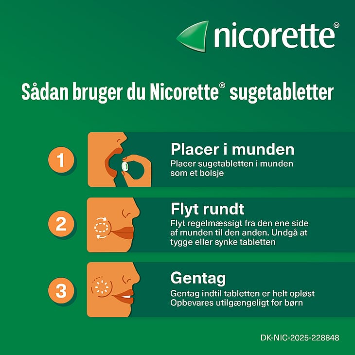 Sugetablet (nicotin), 2 mg og 4 mg sugetabletter til behandling af tobaksafhængighed gennem lindring af nicotintrang og abstinenssymptomer og rygetrang. Anb. brug højst 9 måneder.