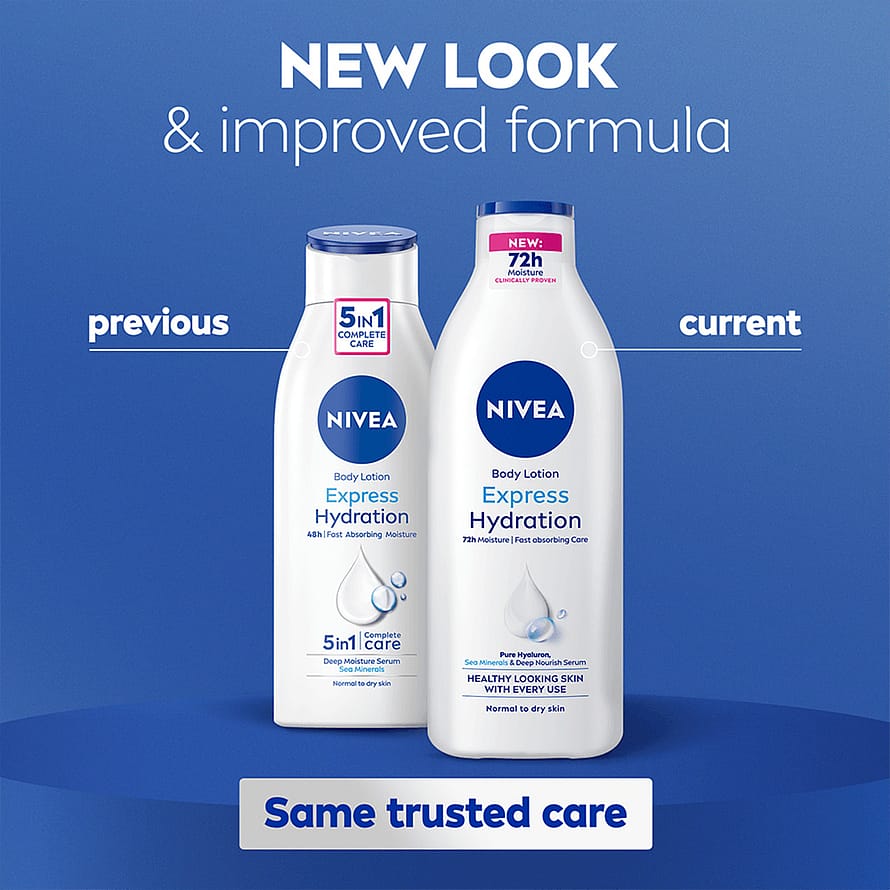 Forvandl din tørre hud med NIVEA® Express Hydration Body Lotion. Giver 5 i 1 komplet pleje: 1. 48 timers dyb fugt, 2. Blød hudfølelse, 3. Hurtigabsorberende, 4. Skønsom pleje og 5. Sund hud.