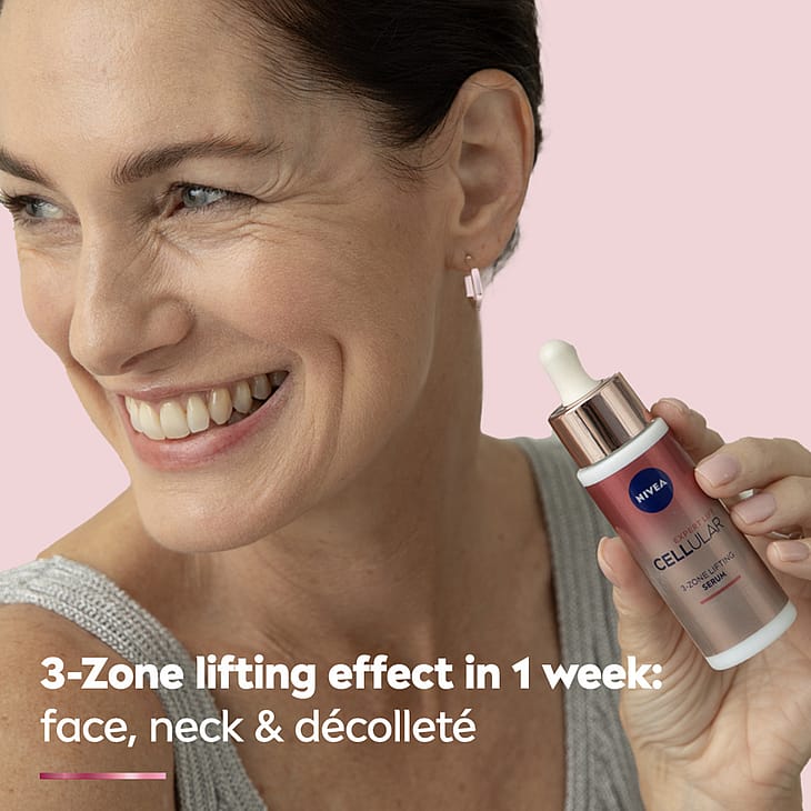Serummet er en effektiv løsning, der arbejder dybt på celleniveau for en 3-zoners løftende effekt på ansigt, hals og dekolletage.