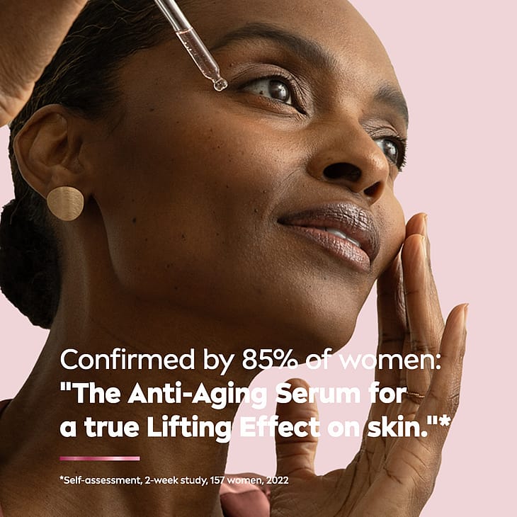 Huden udglattes med mindre synlige rynker Efter 1 uge: Huden er opstrammet. Hudens elasticitet er synligt forbedret**. Efter 2 uger: Hudens struktur er væsentligt styrket på ansigt, hals og dekolletage for 98 % af kvinder*** *testet på hudceller. **Scoreforbedringsrate, 4-ugers undersøgelse, 44 kvinder, 2022. ***Selvvurdering, 2-ugers undersøgelse, 101 kvinder, 2022.