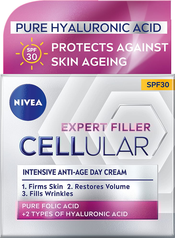 NIVEA Expert Filler Intensive Anti-Age Day Care SPF30 kombinerer kraftfulde anti-age-stoffer for en fyldende 24-timers effekt*.