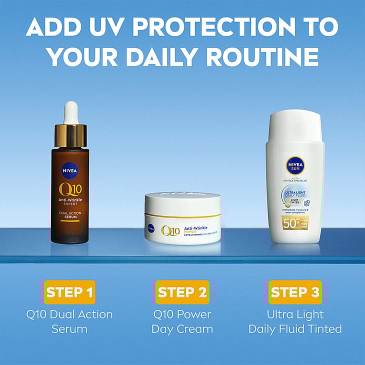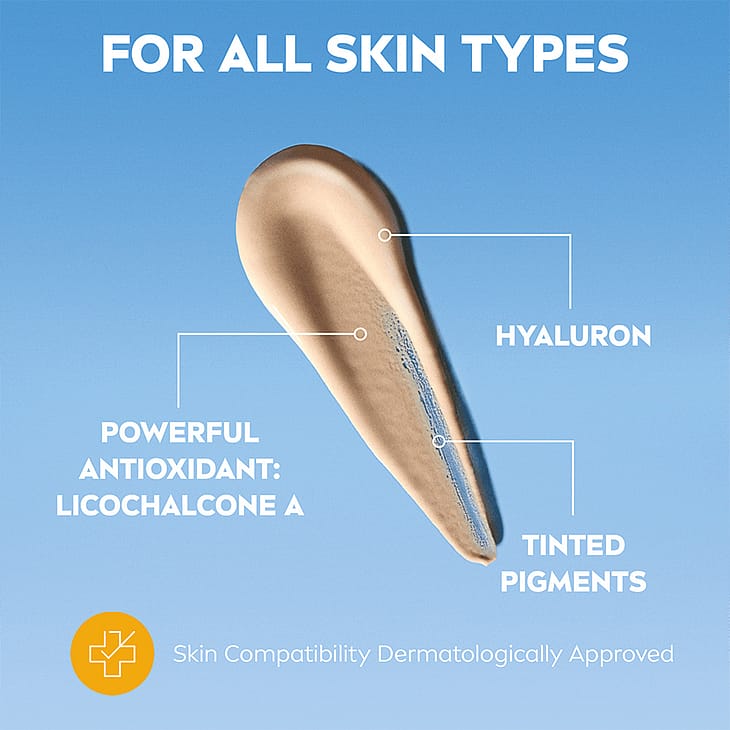 NIVEA SUN UV Face Specialist Ultra Light Daily Fluid Light Tinted SPF 50+ er specielt udviklet til sart ansigtshud. Denne ultralette solcreme beskytter sund hud mod UVA/UVB-stråler og mod effekter af højenergisynligt lys som f.eks. for tidlig ældning af huden. Den er beriget med hyaluron og licochalcone A, en kraftig antioxidant. Formlen med hyaluron fugter med det samme og giver en frisk hudfornemmelse. Derudover aktiverer Licochalcone A hudens egen forsvarsmekanisme og beskytter hudcellerne mod oxidativ stress. Den ultralette væske med tonede pigmenter og matterende effekt er ikke-fedtet og klistrer ikke. Den giver en jævn og naturligt udseende hudtone med langvarig dækning.
